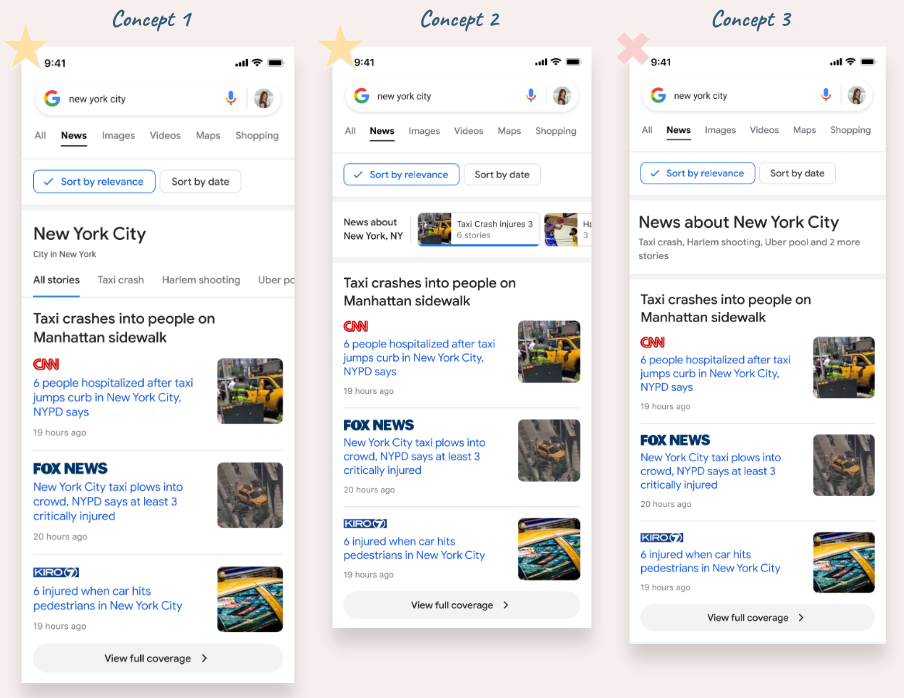 On production, we fall short in helping users understand what to expect in a query result page on Google’s News Mode tab. We give few indications of how results are organized, and offer little recourse if that organization doesn’t meet their needs.